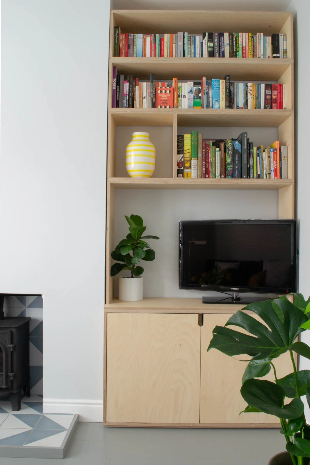 Plywood cupboards and shelves add a contemporary touch to a Victorian house